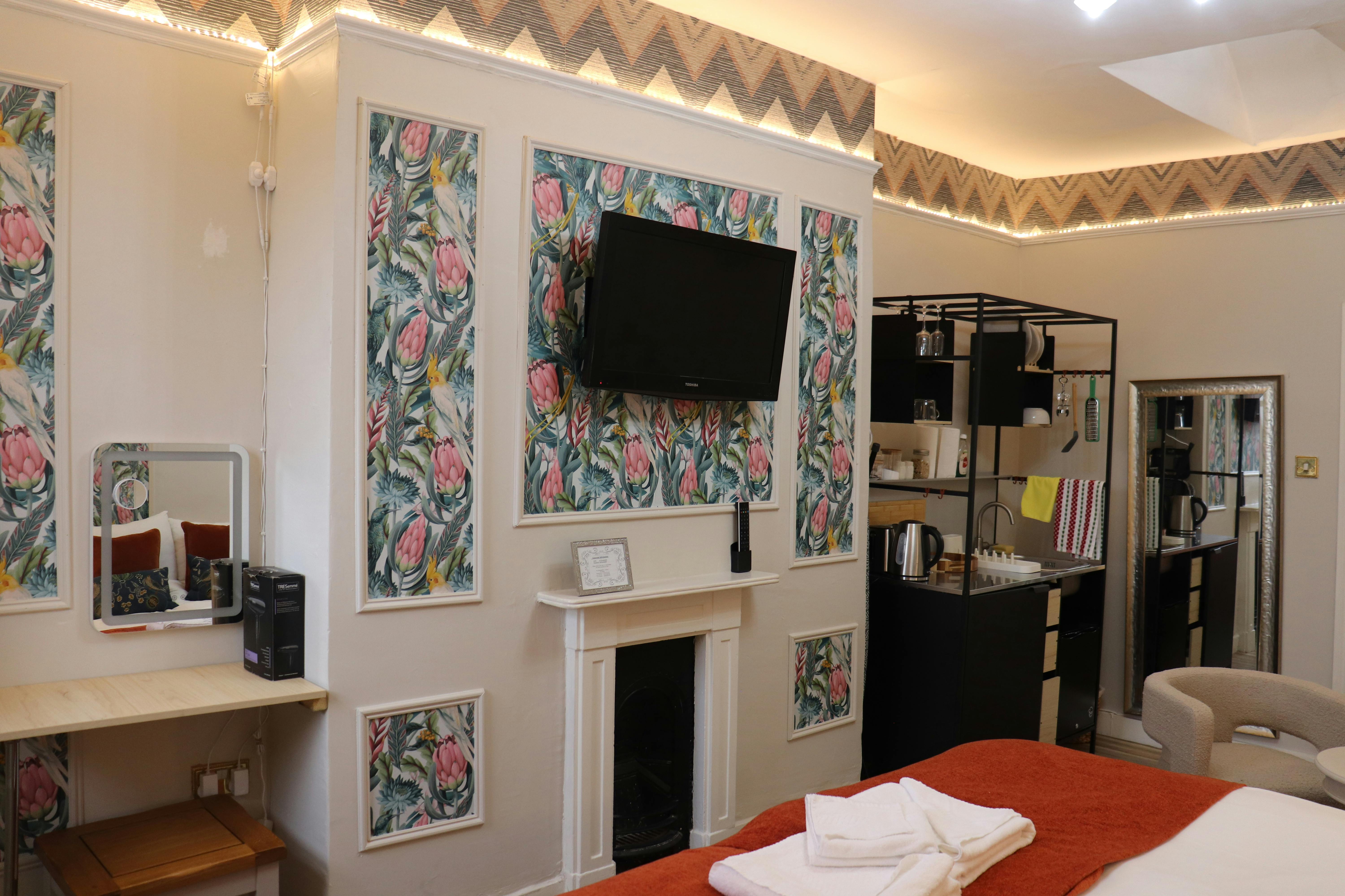With a King Size bed making for a good nights sleep, the room has a kitchenette, microwave, fridge, providing tea/coffee making facilities. Iron and ironing board are also provided.